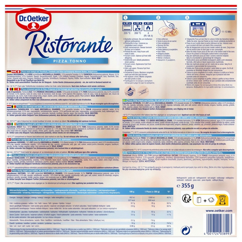 Ingrédients : Farine de BLÉ, 16% FROMAGE (MOZZARELLA, EDAM), 13% purée de tomate, 9,1% THON (Katsuwonus pelamis), eau, 6,5% concentré de tomate, 5,5% oignons, huile de colza, huile de tournesol, huile de soja, 1,8% oignons frits (oignons, huile de colza, huile de tournesol, sel), levure de boulangerie, sel, sucre, huile d'olive vierge extra, origan, basilic, persil, ciboulette, ail, paprika, poivre. Peut contenir : SOJA, MOUTARDE.