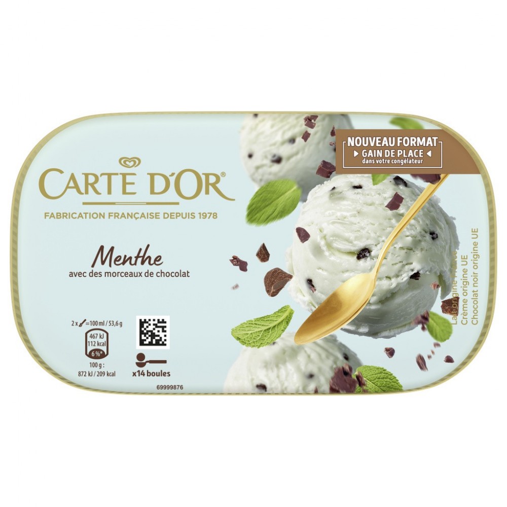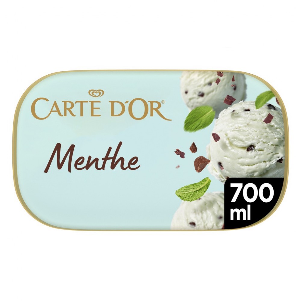 Laissez-vous envoûter par notre crème glacée iconique Menthe au goût intense, dans un nouveau format. Cette glace parfum menthe avec des éclats de chocolat noir, est fabriquée en France avec du lait de nos régions et du cacao certifié Rainforest Alliance. Son bac majoritairement recyclable en carton PEFC issu de forêts gérées durablement. Carte d'Or Menthe est une crème glacée à déguster selon vos envies ! Pour un maximum de plaisir, variez vos desserts avec Carte d'Or : en coupe glacée, en accompagnement d'un dessert ou encore en milk-shake ou smoothie. Parce que l'expertise est au cœur la fabrication de nos glaces, nous nous fournissons en chocolat belge Barry Callebaut, réputé chez les chefs et artisans pour sa qualité supérieure Expert culinaire depuis sa création en France en 1978, Carte d'Or imagine des recettes de crèmes glacées et de sorbets aussi originales que savoureuses, à partir d'ingrédients de qualité. Riche de 40 ans d'authenticité, de créativité et de passion, Carte d'Or innove chaque année en développant de nouvelles gammes et des parfums originaux. Découvrez également au sein de notre gamme Les Essentiels : Vanille de Madagascar, Café Arabica ou encore notre sorbet plein fruit Citron de Sicile. Carte d'Or se déguste à toutes les occasions : en famille, à la fin d'un repas, seul ou en accompagnement d'un dessert, ou bien au goûter pour une pause gourmande.