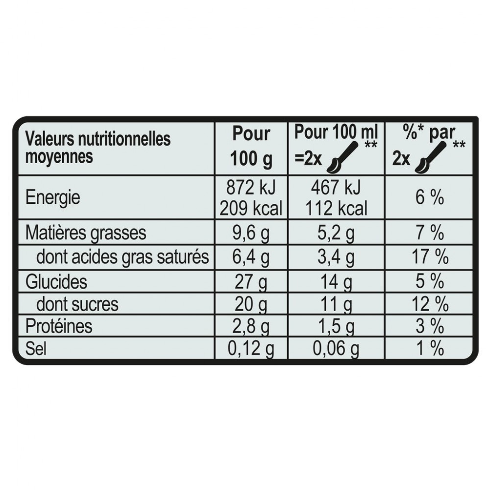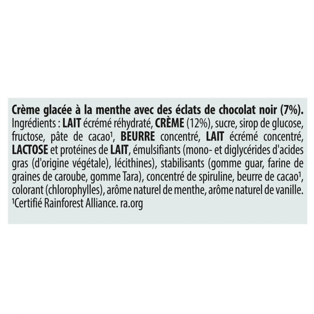 Ingrédients : LAIT écrémé réhydraté, CRÈME (12%), sucre, sirop de glucose, fructose, pâte de cacao1, BEURRE concentré, LAIT écrémé concentré, LACTOSE et protéines de LAIT, émulsifiants (mono- et diglycérides d'acides gras (d'origine végétale), lécithines), stabilisants (gomme guar, farine de graines de caroube, gomme Tara), concentré de spiruline, beurre de cacao1, colorant (chlorophylles), arôme naturel de menthe, arôme naturel de vanille. 1Certifié Rainforest Alliance.