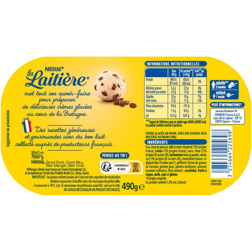 Eau, sirop de glucose, LAIT écrémé réhydraté 12% (origine France), CRÈME 12% (origine France), sucre, rhum 5,5% (origine UE/non UE), poudre de LACTOSÉRUM doux, raisins secs 5% (origine non UE), émulsifiant (mono- et diglycérides d'acides gras*), gélifiants (farine de graines de caroube, gomme guar, gomme xanthane), colorant (caramel ordinaire). Peut contenir : ARACHIDES, FRUITS A COQUE, ŒUFS, SOJA et CÉRÉALES CONTENANT DU GLUTEN *d'origine végétale. Ce produit contient 1,3% vol. d'alcool.
