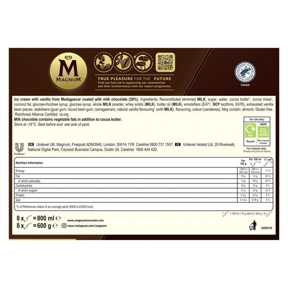 Le classique des classiques ! Le bâtonnet glace Magnum Classic, c'est un chocolat au lait croquant enrobant une onctueuse glace à la vanille qui saura satisfaire les plus gourmands. Parfum historique et emblématique de Magnum, ce bâtonnet gourmand Magnum Classic est un incontournable dans l'univers de la crème glacée depuis plus de 25 ans. La gourmandise ultime pour ceux qui recherchent un maximum de plaisir. Pour profiter pleinement de leurs saveurs, sortez vos glaces Magnum du congélateur quelques minutes avant de les déguster. Magnum voit le jour en 1989 afin de satisfaire un désir de gourmandise activement recherché par les adultes. Le bâtonnet, un format jusque-là plutôt réservé aux enfants, se pare alors d'un enrobage au chocolat de grande qualité. Magnum devient ainsi la première marque de glaces entièrement consacrée aux plaisirs gourmands des adultes. Depuis, Magnum ne cesse de surprendre en élargissant chaque année son offre de nouveaux parfums. Aujourd'hui leader sur le marché de la glace, la marque offre une expérience toujours plus intense et premium. Les créations Magnum ? Irrésistibles de l'extérieur, onctueuses à l'intérieur, aussi savoureuses qu'intemporelles, elles ont su traverser les modes et s'imposer comme des saveurs incontournables. Leur signature ? Une forme emblématique, des parfums synonymes de plaisir à l'état pur et ce fameux chocolat craquant incomparable, qui n'a jamais failli à ses délicieuses promesses ! Magnum s'engage en certifiant la qualité et l'origine de ses ingrédients. 100 % du cacao du chocolat Magnum est cultivé de façon durable dans des plantations labellisées Rainforest Alliance, une ONG internationale qui agit sur 3 piliers : écologique, social et économique. À redécouvrir et à savourer, encore et toujours. Magnum, fidèle au plaisir.
