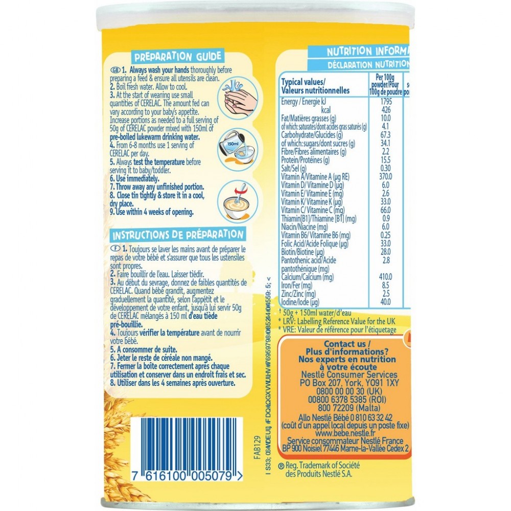 Cerelac de Nestlé est un aliment de diversification dès 6 mois destiné à la consommation à la cuillère. Il ne doit pas être utilisé comme un substitut du lait maternel. L'OMS recommande l'allaitement exclusif pendant les 6 premiers mois. Sauf avis contraire de votre professionnel de la santé, l'introduction d'aliments solides doit commencer au environ de 6 mois, mais pas après 6 mois, ni introduit avant 4 mois. Pour la santé de votre bébé, toutes les instructions de préparation doivent être suivies scrupuleusement. Soyez attentif à ne pas suralimenter votre bébé, arrêter l'alimentation lorsque votre bébé montre des signes de rassasiement en tournant leur tête par exemple.