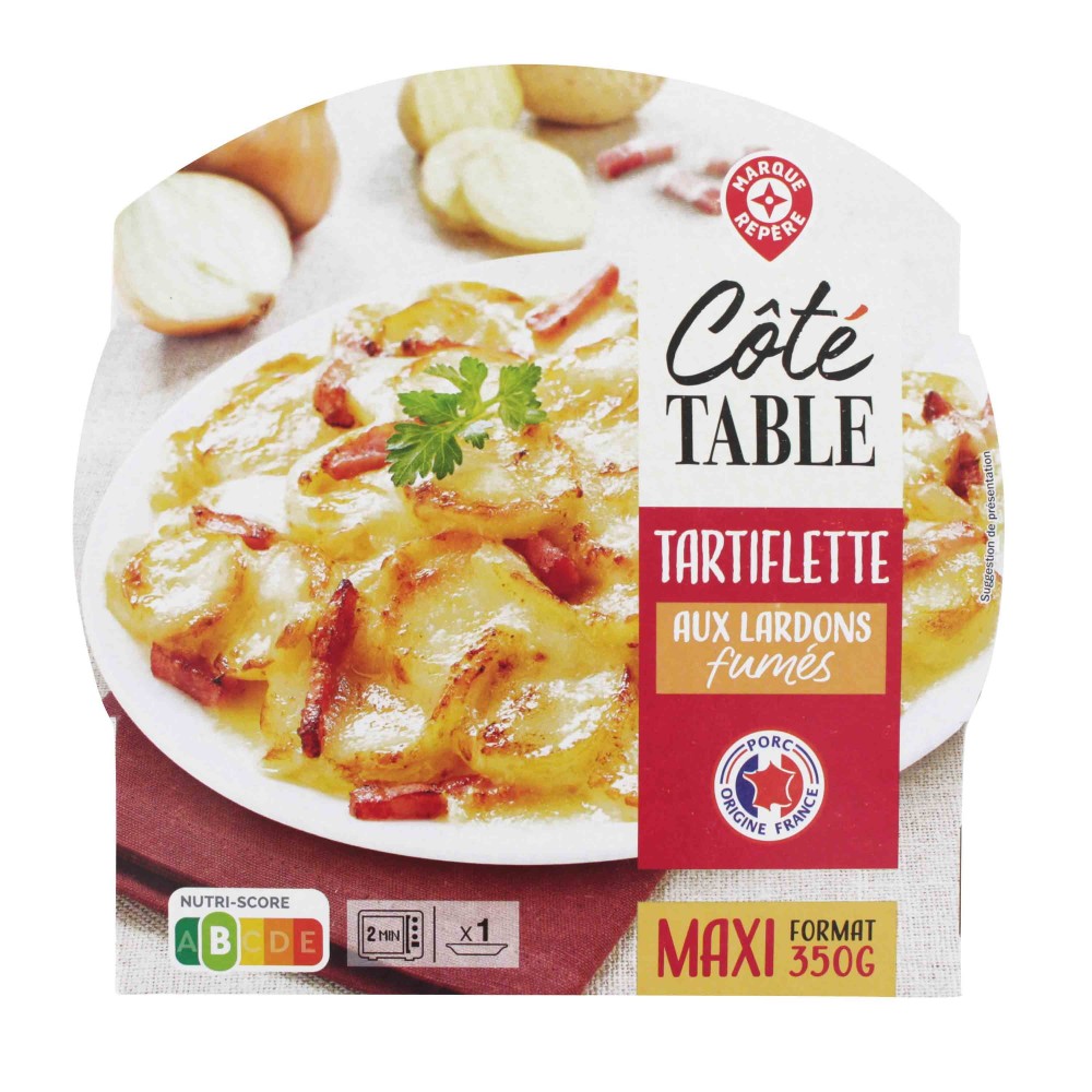 Ingrédients: Pommes de terre 48 % (pommes de terre, antioxydant : acide ascorbique, conservateur : disulfite de sodium) ; eau ; lardons fumés cuits 9 % (poitrine de porc, sel, arômes naturels, antioxydant : acide ascorbique) ; oignons 4,8 % ; reblochon 3,5 % (lait cru, sel, ferments [dont lait], présure, colorant : norbixine de rocou) ; crème 2 % ; amidon modifié de maïs ; vin blanc (dont sulfites) ; sel ; huiles végétales (colza, coprah) ; protéines de lait ; gélifiants : gomme guar, gomme xanthane ; arôme naturel ; épices ; arôme naturel de muscade.