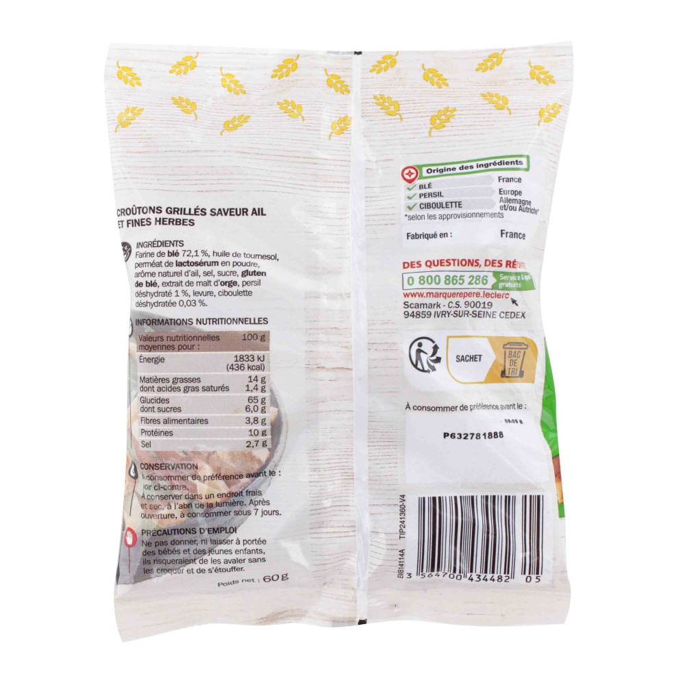 Ingrédients : Farine de blé 72,1 %, huile de tournesol, perméat de lactosérum en poudre, arôme naturel d'ail, sel, sucre, gluten de blé, extrait de malt d'orge, persil déshydraté 1 %, levure, ciboulette déshydratée 0,03 %.