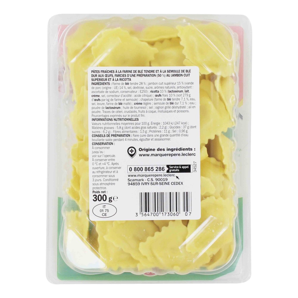 Pâtes fraîches à la farine de blé tendre et à la semoule de blé dur aux œufs, farcies d'une préparation (50%) au jambon cuit supérieur et à la ricotta