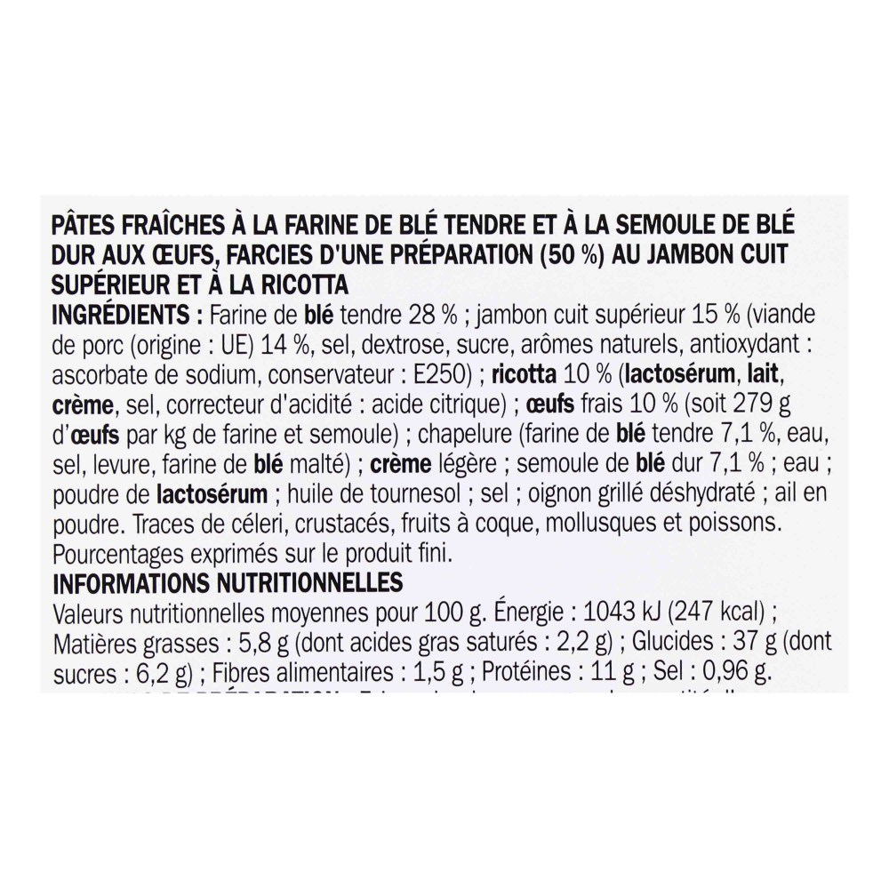 Farine de blé tendre 28 % ; jambon cuit supérieur 15 % (viande de porc origine : UE) 14 %, sel, dextrose, sucre, arômes naturels, antioxydant : ascorbate de sodium, conservateur : E250) ; ricotta 10 % (lactosérum, lait, crème, sel, correcteur d'acidité : acide citrique) ; œufs frais 10 % (soit 279 g d’œufs par kg de farine et semoule) ; chapelure (farine de blé tendre 7,1 %, eau, sel, levure, farine de blé malté) ; crème légère ; semoule de blé dur 7,1 % ; eau ; poudre de lactosérum ; huile de tournesol ; sel ; oignon grillé déshydraté ; ail en poudre. Traces de céleri, crustacés, fruits à coque, mollusques et poissons. Pourcentages exprimés sur le produit fini.