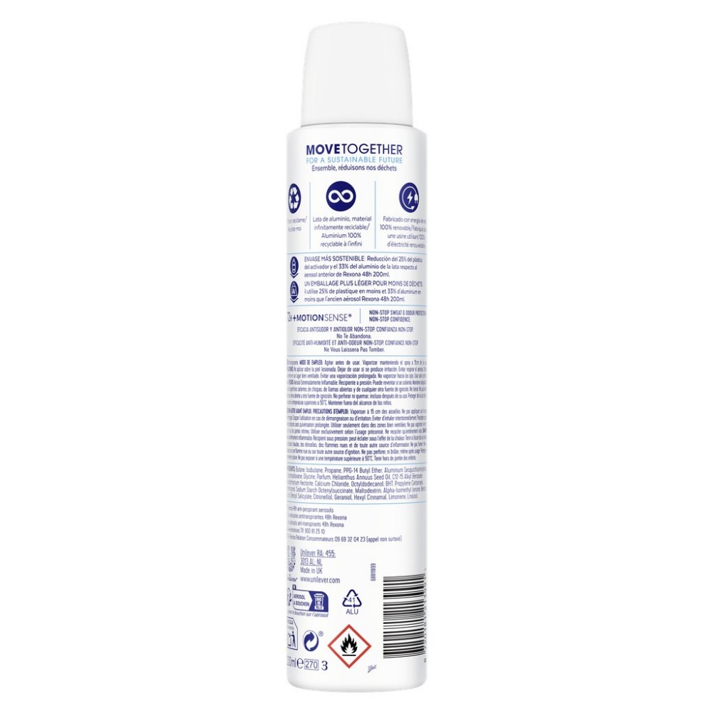 L'anti-transpirant Rexona Cotton Dry vous permet de bouger en toute confiance. En plus de vous protéger pendant 72 h contre l'humidité et les odeurs grâce à sa technologie anti-transpirante brevetée, sa formule sans alcool laisse sur vos aisselles un parfum délicat aux notes florales, évoquant la légèreté et la fraîcheur du coton. Avec le spray anti-transpirant Rexona Cotton Dry, vous vous sentez forte et sûre de vous toute la journée ! De plus, le flacon de cet anti-transpirant est majoritairement recyclable, pensez au tri ! Cet anti-transpirant a été fabriqué dans une usine utilisant 100 % d'électricité renouvelable. Jour après jour, les anti-transpirants Rexona vous protègent et vous apportent fraîcheur et confort à chacun de vos mouvements. L'anti-transpirant femme Rexona Cotton Dry vous est proposé au format 200 ml. Découvrez-le également au format bille avec Rexona Déodorant Femme Bille Anti-Transpirant 72H Cotton Dry 50 ml. Rexona est LA marque de l'efficacité. Ses produits ont été conçus pour en faire plus, tout comme vous. Escalader une montagne, prendre le bus, faire une présentation ou vous préparer pour votre premier rendez-vous : quoi qu'il arrive, vous pouvez compter sur l'efficacité Rexona. Nous nous appuyons sur notre longue expérience pour vous proposer des technologies anti-transpirantes exclusives, comme Body Heat Activated. Les molécules anti-transpirantes de la technologie brevetée Rexona s'organisent en un maillage serré pour réguler le flux de transpiration de façon ultra-efficace et vous offrent une haute performance durable. Rexona ne vous laissera jamais tomber. Technologie anti-transpirante brevetée et activée par la chaleur du corps pour 72 h de protection anti-transpirante. 72 h d'efficacité anti-humidité et anti-odeur non-stop. 0% alcool.