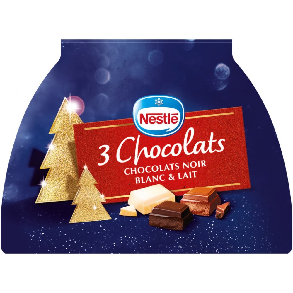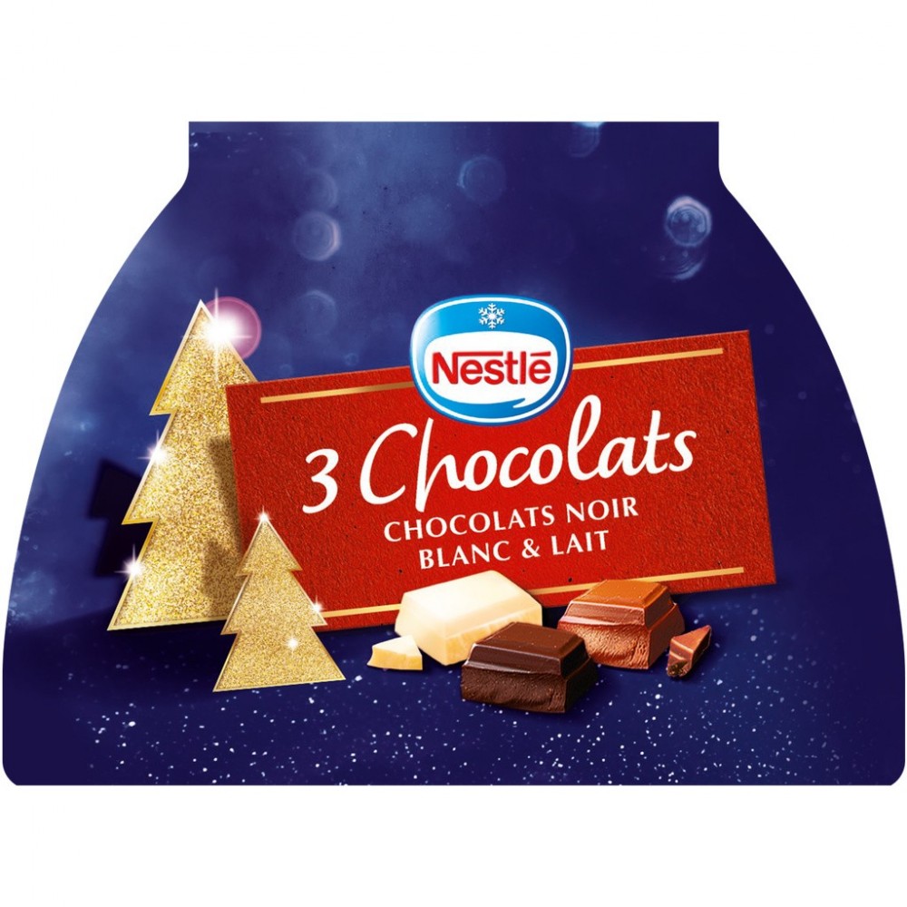 Glaces au chocolat noir, au chocolat blanc, au chocolat au lait, pépites de chocolat noir (2%), copeaux de chocolat blanc (1.5%), décor en chocolat blanc (0.7%), sauce au chocolat (0.9%)